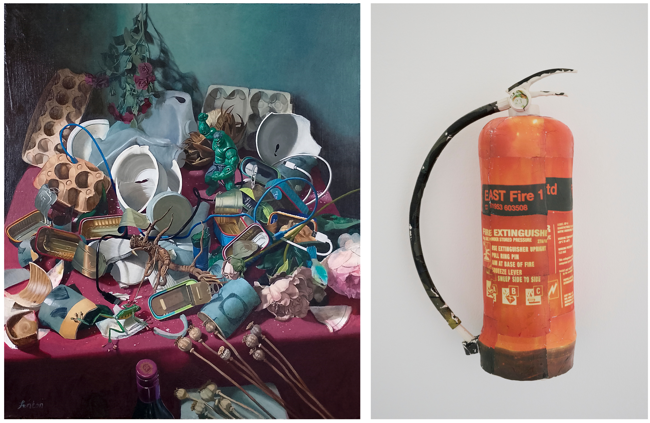 Mike Fenton, Broken, Empty 2025, Oil on Board, © Courtesy the Artist; Rollo Timothy George, Fire Extinguisher, 2024, porcelain © Rollo Timothy George